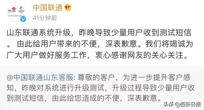 随后,中国联通微博发布消息称:山东联通系统升级,昨晚导致少量用户收到测试短信。 由此给用户带来的不便,深表歉意。我们将竭诚为广大用户做好服务工作,衷心感谢网友的关心关注。