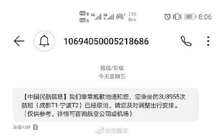 网友们纷纷晒出自己收到的取消航班短信——