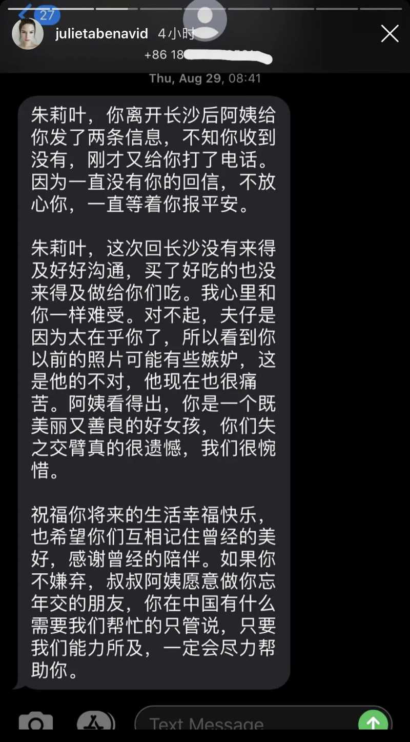 朱丽叶晒出疑似蒋劲夫母亲发给她的短信内容,短信中显示,当时朱丽叶离开长沙回到上海,因为蒋母担心她的安危所以先后给她发了数条短信和一通电话。