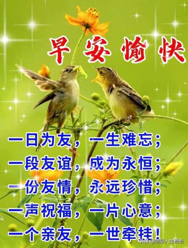 9、早安,我最好的朋友!鸟儿在窗外歌唱,阳光洒在你身上,这一刻,一切都是那么美好。愿你的一天充满欢笑和快乐,愿我们的友情像这清晨一样,纯净而美好。无论何时何地,我都会想念你。