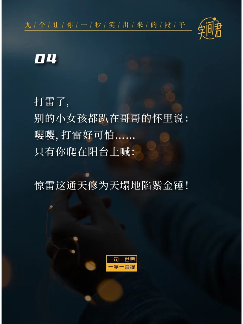 3.打雷了,别的小女孩都趴在哥哥的怀里说嘤嘤,打雷好可怕.....只有你爬在阳台上喊: