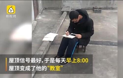 特殊时期,学校选择了网上开课。小通因家中没有WiFi,又舍不得用流量,就向邻居求助,蹭隔壁家的WIFI。屋顶信号最好,于是才有了“学霸上屋顶”的励志一幕。