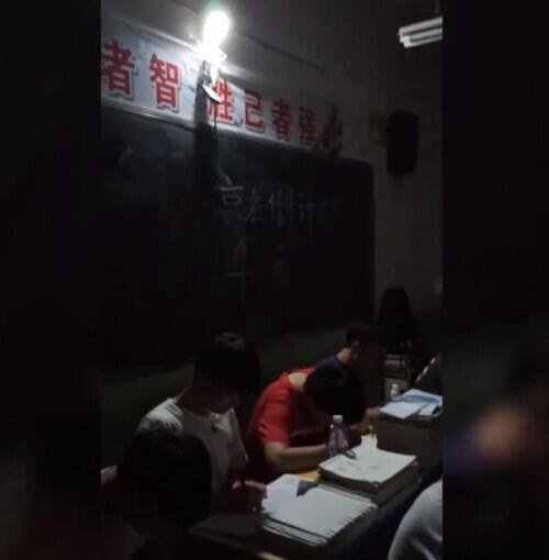 高三的学生们为上晚自习,将2盏台灯挂到教室前后的黑板上,继续学习。数学老师雷忠霖感动流泪,记录下了这一幕。