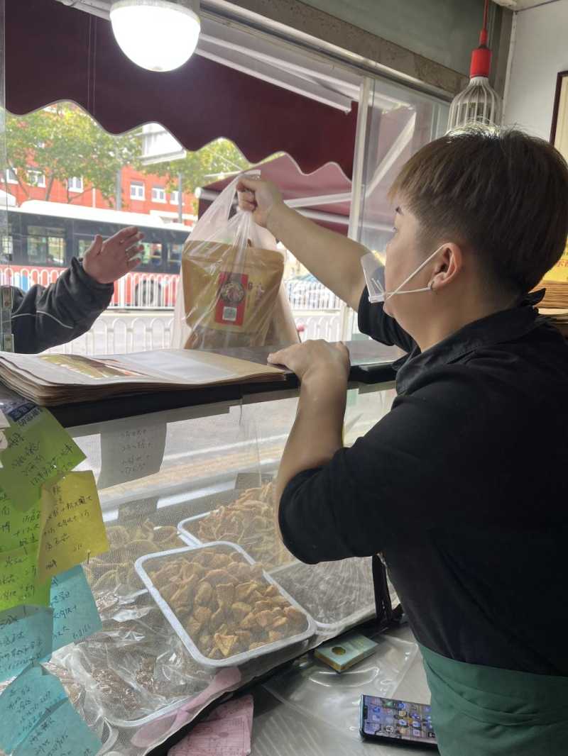 晓芳姐个子不高,一头短发,搭配一身黑的着装,十分干练。她时而热情地招呼着过路的客人,时而回复着手机订购消息。虽然来往的客人不多,但是记者到店时展柜前已粘了一排排便利签,她告诉记者,这是每天线上的订单。一天下来,全国各地线上的订单有很多,常常都忙不过来。