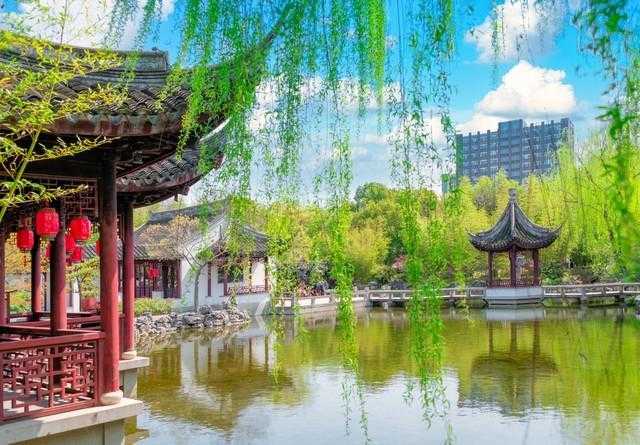 高高的柳树长满了嫩绿的新叶,轻垂的柳条像千万条轻轻飘动的绿色丝带。