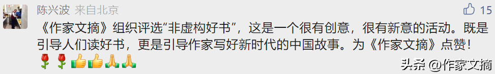 陈兴波(北京):《作家文摘》组织评选非虚构好书,这是一个很有创意,很有新意的活动。既是引导人们读好书,更是引导作家写好新时代的中国故事。