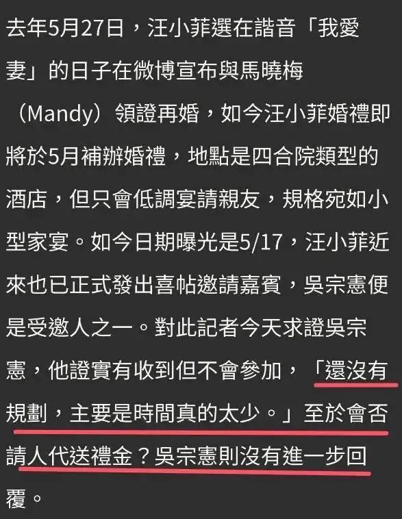 汪小菲将于5月17日与马筱梅结婚,选这一天因去年领证时间一致、527谐音“我爱妻”及周末方便孩子不用上学。邀请吴宗宪但因无时间缺席,疑与大S相关。媒体批其冷血,称孩子失母后即参加婚礼不妥,而未通知孩子参加母葬礼亦被指残忍。S妈因女儿去世疑精神异常,大S好友透露曾两次托梦传递信息,引发舆论争议。