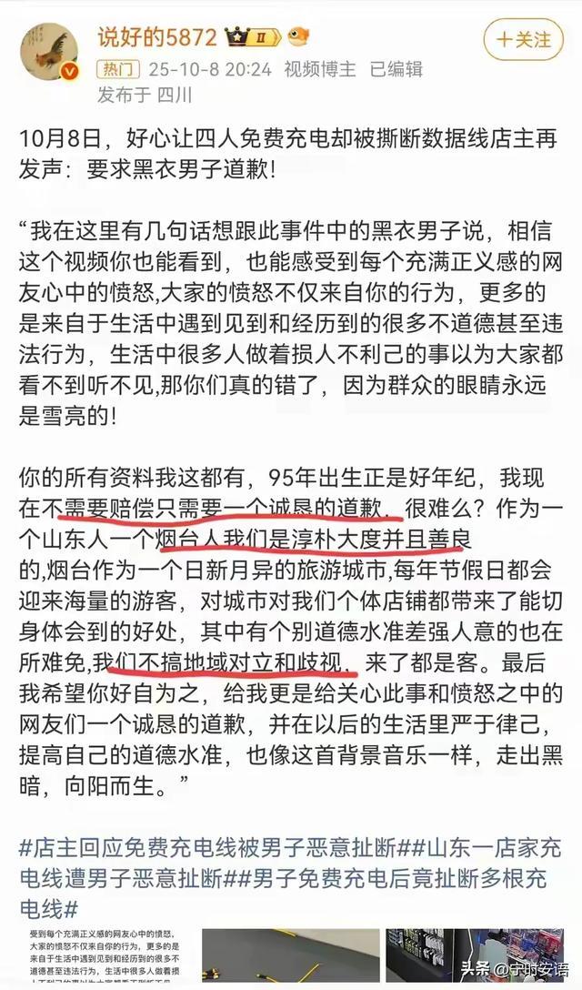 那个扯坏店主数据线的人主动承认自己的行为,并主动联系了店主石先生, 可他依然为自己的为自己的错误找借口,同行女子直接脏话骂店主, 声称自己被网暴了,要找律师维权,态度很嚣张。