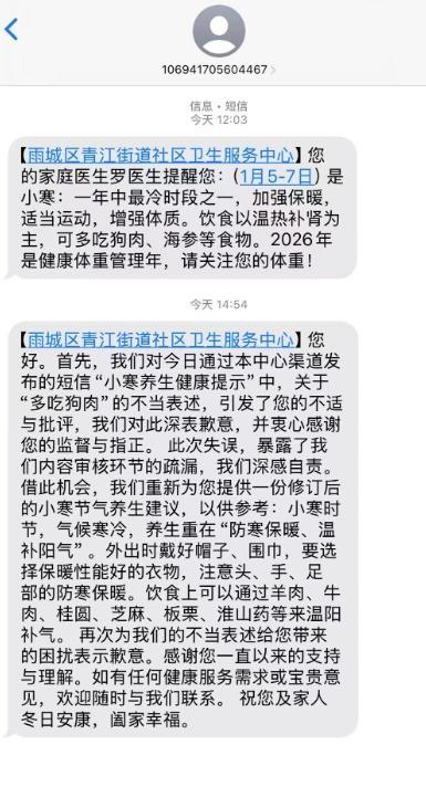 1月5日,四川省雅安市雨城区青江街道社区卫生服务中心给当地市民发送一则短信提醒,短信内容显示:您的家庭医生罗医生提醒您,1月5-7日是小寒,一年中最冷时段之一,加强保暖,适当运动,增强体质。饮食以温热补肾为主,可多吃狗肉、海参等食物。