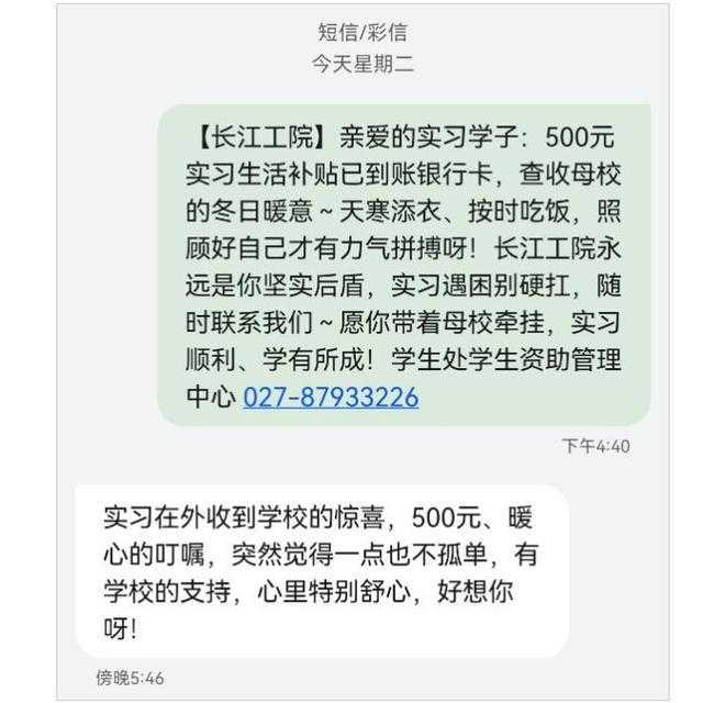 “亲爱的实习学子:500元买习生活补贴已到账银行卡,查收母校的冬日暖意~天寒添衣、按时吃饭,照顾好自己才有力气拼搏呀!长江工院永远是你坚实后盾,实习遇困别硬扛,随时联系我们~愿你带着母校牵挂,实习顺利、学有所成!学生处学生资助管理中心027-87933226”