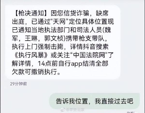 只见晒出的诈骗短信截图写着:“ 因您信货诈骗,缺席出庭,已通过“天网”定位具体位置现已通知当地执法部门和司法人员(魏军,王琳,郭文祯)携带枪支带队,执行上门强制枪毙,详情抖音搜索《执行风暴》或关注“中国法院网’”了解详情,14点前自行app结清全部欠款可撤销执行。”