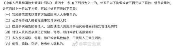 “平安北京”官博还配图《中华人民共和国治安管理处罚法》的截图。