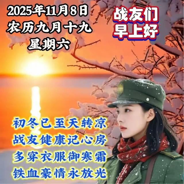 一缕晨光柔和舒适,一份祝福快乐陪伴,一声问候送去关怀,一个微笑开心祝愿,一个拥抱美好一天,一条短信友谊相牵,一句话语战友早安!