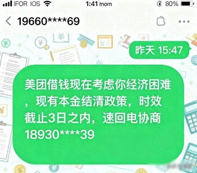 河南的司女士最近遇到一件烦心事,11月上旬她接到两条短信,说她在美团借钱逾期了,还能申请本金补贴,但要在10号前联系,不然就永久作废,可短信是个私人号码发来的,不是美团的官方号码,她试着打回去,要么打不通,要么对方接通就挂掉,甚至反过来威胁她说要报警。