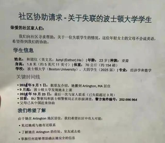 和珺仪身高1米8,是波士顿大学经济学和数学双学位学生。9月刚搬到马萨诸塞州阿灵顿的新住处,结果呢?学校发现她压根没去上课,朋友约饭也直接放鸽子。10月23日那天,她给家里发了条没头没尾的短信,就像人间蒸发似的,电话微信全黑屏。她爸妈急得像热锅上的蚂蚁,11月14日直接飞到美国,可女儿还是杳无音信。有网友猜测是不是学业压力太大躲起来了,毕竟经济学和数学这组合听着就头大。也有人担心她可能遇到危险,毕竟异国他乡人生地不熟。她爸提到个细节:以前联系不上还能通过信用卡消费知道她在哪,这次连这点线索都断了,简直像被按了静音键。更让人揪心的是,她最后爽约的那顿饭,原本是朋友特意为她解压安排的。