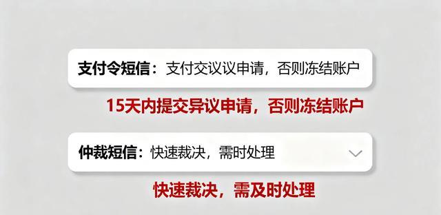 第七种:支付令和仲裁短信,这两种短信相信很多人都比较陌生,你如果收到支付令的短信一定要注意了,要在十五天之内及时提交支付另议申请。如果不处理的话,十五天的时间到了,你的支付工具和银行卡就会被冻结。还有一种是仲裁短信,收到这种短信也一定要处理。这种属于快速解决方式,就是不开庭直接做出裁决。