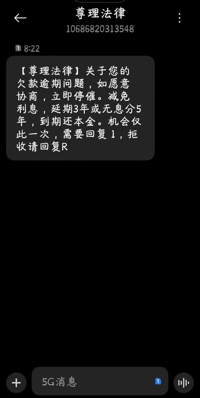 【尊理法律】关于您的欠款逾期问题,如愿意协商,立即停催。减免利息,延期3年或无息分5年,到期还本金。机会仅此一次,需要回复 1,拒收请回复R。