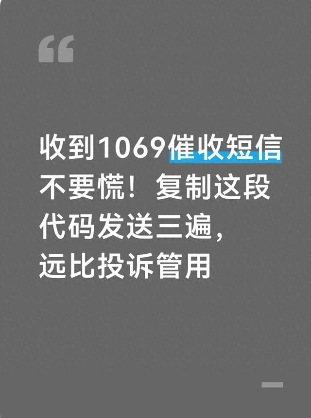 其实大家不用慌,1069开头的短信根本没那么可怕,更不用被里面的威胁话术吓到。今天就给大家分享一个亲测有效的方法,不用跟催收扯皮,不用打一堆投诉电话,只要复制一段代码,发送三遍,就能直接切断骚扰源头,比普通投诉管用多了,关键是全程合法合规,操作还特别简单。