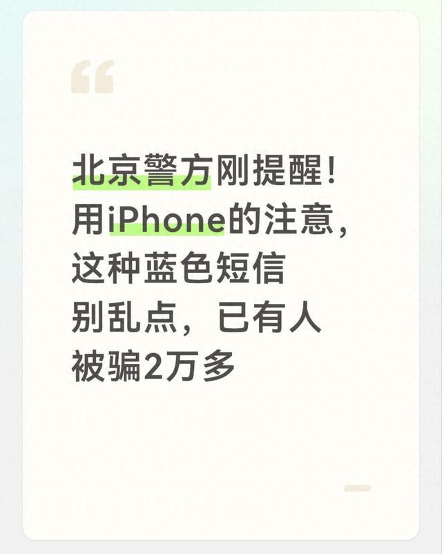 北京警方刚发了紧急预警,专门针对苹果手机用户。最近一个月,全市已经有12个人中招,总共被骗走26万多,平均下来一人损失超2万。骗子就盯着iPhone、iPad这些苹果设备,专走蓝色气泡的iMessage发短信,伪装得特别像真的,很多人一不留神就踩坑。今天就把这事说透,不夸大、不啰嗦,全是实在话,看完你就知道怎么防。