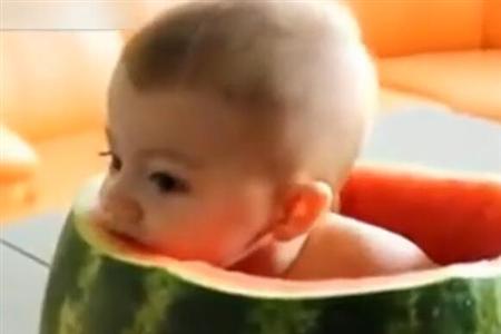 笑死人了,一个小孩坐在西瓜里吃西瓜