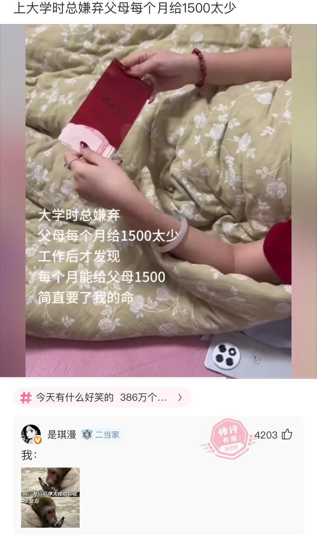 13.上大学时总嫌弃父母每个月给1500,太少了。