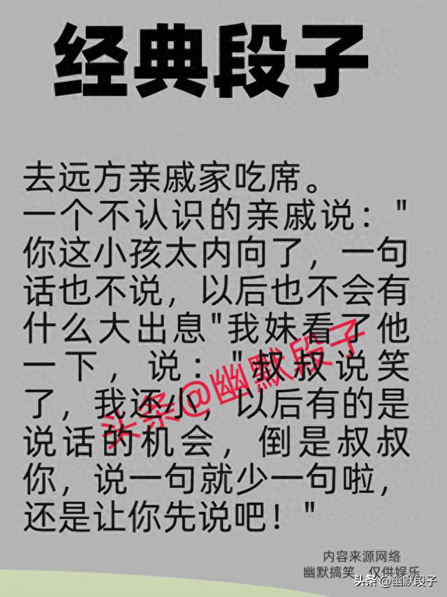 生活里的搞笑瞬间总在不经意间,几句巧怼、一个反转,既能让人笑出声,又藏着满满的人间真实,今天就和大家唠唠这些接地气的趣味事儿,看完保准心情翻倍。