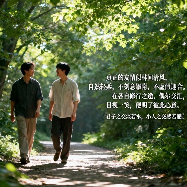 2. 真正的友情似林间清风,自然轻柔,不刻意攀附,不虚假迎合。在各自修行之途,偶尔交汇,相视一笑,便明了彼此心意。“君子之交淡若水,小人之交甘若醴。”