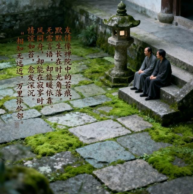 3. 友情像禅院中的苔痕,默默生长在时光角落。无需言语,却能在寂寥时,给予温暖依靠。风雨同舟,岁月更迭,情谊如苔,愈发深沉。“相知无远近,万里尚为邻。”