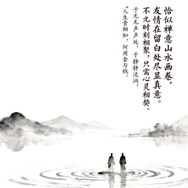 6. 恰似禅意山水画卷,友情在留白处尽显真意。不必时刻相聚,只需心灵相契。于无声处,感受彼此的牵挂,情谊在岁月间,静静流淌。“人生贵相知,何用金与钱。”