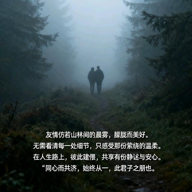 9. 友情仿若山林间的晨雾,朦胧而美好。无需看清每一处细节,只感受那份萦绕的温柔。在人生路上,彼此依偎,共享这份静谧与安心。“同心而共济,始终如一,此君子之朋也。”
