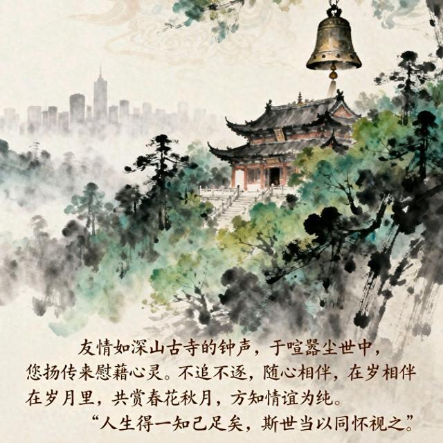 1. 友情如深山古寺的钟声,于喧嚣尘世中,悠扬传来慰藉心灵。不追不逐,随心相伴,在岁月里,共赏春花秋月,方知情谊至纯。“人生得一知己足矣,斯世当以同怀视之。”