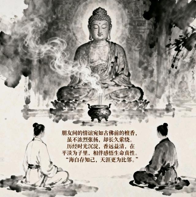 4. 朋友间的情谊宛如古佛前的檀香,虽不浓烈张扬,却长久萦绕。历经时光沉淀,香远益清,在平淡日子里,相伴感悟生命真谛。“海内存知己,天涯若比邻。”