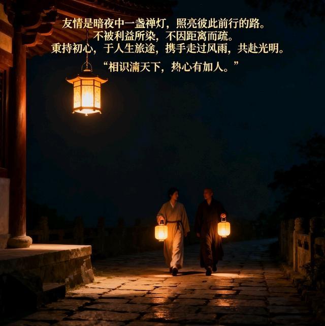 5. 友情是暗夜中一盏禅灯,照亮彼此前行的路。不被利益所染,不因距离而疏。秉持初心,于人生旅途,携手走过风雨,共赴光明。“相识满天下,知心能几人。”