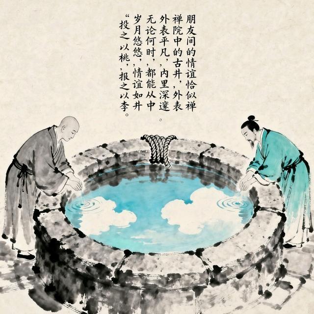 10. 朋友间的情谊恰似禅院中的古井,外表平凡,内里深邃。无论何时,都能从中汲取清凉与力量,岁月悠悠,情谊如井,永不干涸。“投之以桃,报之以李。”