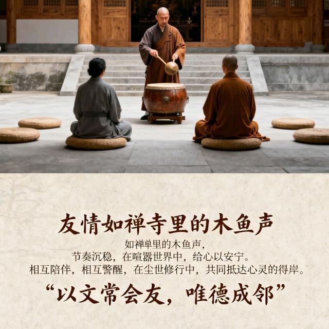 7. 友情如禅寺里的木鱼声,节奏沉稳,在喧嚣世界中,给心以安宁。相互陪伴,相互警醒,在尘世修行中,共同抵达心灵的彼岸。“以文常会友,唯德自成邻。”