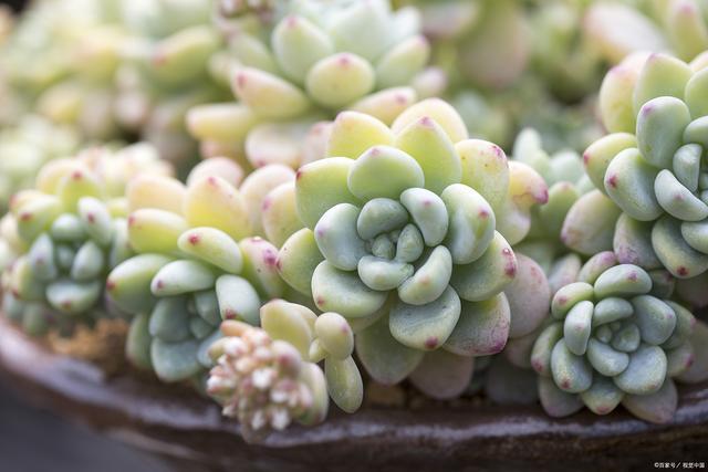 小多肉的样子很特别。它的茎细细的、短短的,藏在厚厚的叶子下面,几乎看不见。它的叶子一片挨着一片,围成一个小小的莲花形状,颜色是嫩绿色的,顶端还带着一点点淡淡的粉色,像害羞的小脸蛋。用手轻轻摸一摸,叶子软软的、滑滑的,捏一下还能感觉到里面有满满的水分,舒服极了。
