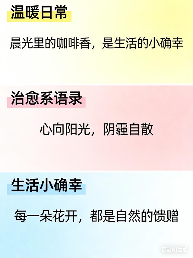 再看文艺清新风,温柔又有质感,适合记录生活、抒发心境。在快节奏的当下,大家都偏爱安静治愈的表达。“在时光的长河中,我们都是那匆匆的摆渡人。每一朵浪花都是生活的馈赠,或温柔,或汹涌。让我们怀揣着对远方的憧憬,在岁月的波光里,书写属于自己的诗意篇章。”这类句子不浮夸、不刻意,搭配风景照、日常碎片,氛围感直接拉满。不管是清晨散步、傍晚看云,还是独处思考,用文艺清新的文字定格瞬间,既能安抚情绪,也能留下温柔的记忆,很受年轻人喜欢。最后是励志热血风,给奋斗路上的人加满能量。很多人在学习、工作中容易懈怠,需要一句狠话点醒自己。“别在该奋斗的年纪选择安逸,你背不下来的书,总有人能背下来;你做不出来的题,总有人今天努力做完。那么不好意思,你想去的学校也只能别人去了,你想过的人生也只能别人过了。所以,加油吧,少年!”直白又有力量,不灌鸡汤、不打鸡血,句句戳中痛点。适合学生党备考、打工人拼搏、创业者坚持,用来做座右铭、朋友圈激励,或是自我打气,都能瞬间找回状态。
