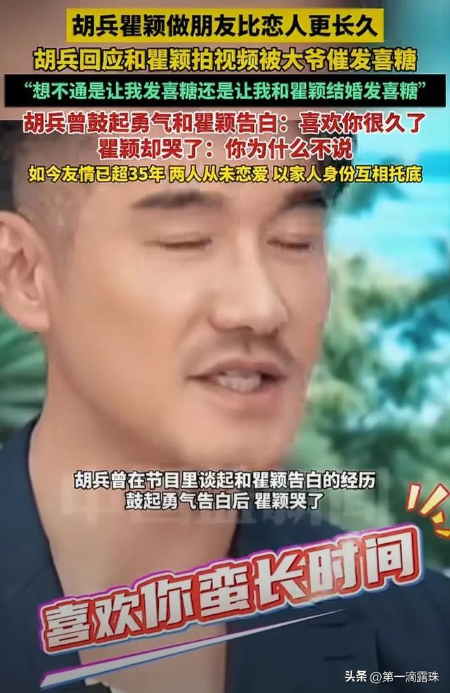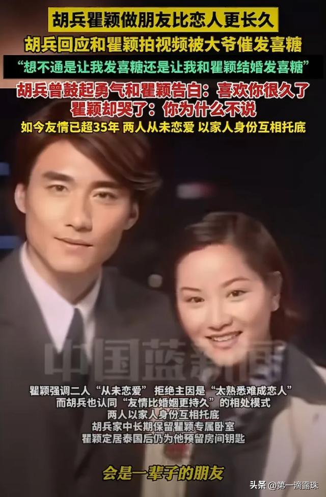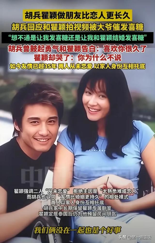 不过两人的神仙友情里,也藏着胡兵的遗憾,他一直喜欢瞿颖,却数次因时机不对错过表白,后来在大约2003年前后,在飞机上,胡兵曾鼓起勇气向瞿颖表白过,瞿颖很感动,但思考过后,还是拒绝了。