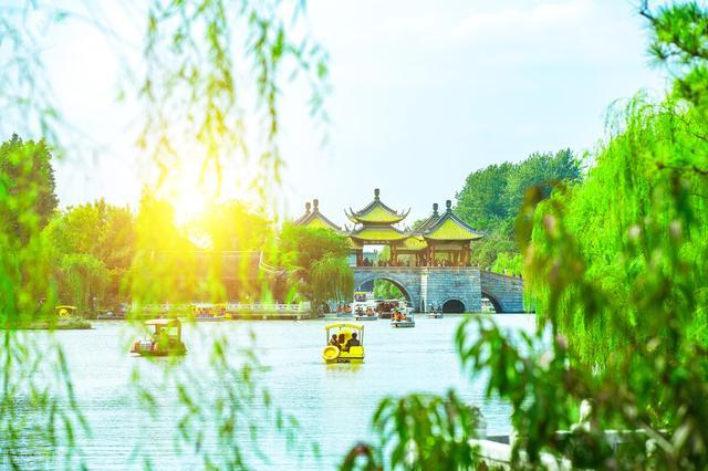 烟花三月的瘦西湖,有着扬州最美的时光,身比西湖瘦,碧水含烟柳。湖面瘦长,岸边碧绿的垂柳映衬着齐放的百花,就像一幅上了色的水墨画,清丽淡雅。不到瘦西湖,枉到扬州~