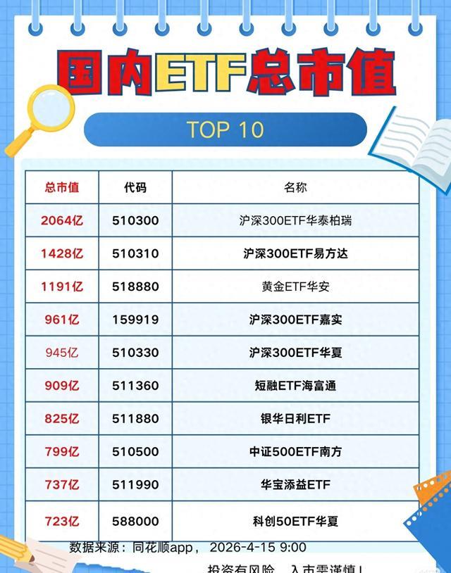 最近刷到一张截至2026年4月15日的国内ETF总市值TOP10榜单,不少人扫一眼就划走了,觉得这都是机构玩的东西,跟咱们普通散户没关系。可你仔细品品这张名单,藏着A股最真实的投资逻辑,也给咱们普通人指了一条最稳的赚钱路。很多人买基金,总想着追热点、找妖基,觉得越复杂、越小众的产品越能赚大钱,结果追涨杀跌亏得一塌糊涂,可你看这市值前十的ETF,清一色都是宽基、黄金、货币这类“笨笨的”产品,反而成了市场上最受欢迎、规模最大的选择。这背后的门道,今天咱们就用大白话掰扯明白,让你看完就懂,再也不瞎买基金。