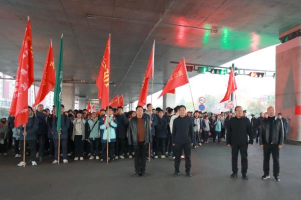 随后,校领导手持鲜红的校旗,郑重地将校旗交予他们:“带着这份责任,带着学校的期望,出发吧!” 旗手们双手接过校旗,用力挥舞,深蓝色的班旗与红色的校旗在晨光中交织,构成了校园里最动人的画面。“我宣布,临汾一中2026届高三励志远足,正式出征!” 随着校领导的号令,队伍如同一条长龙,朝着学校南门缓缓移动,开启了20公里的征途。