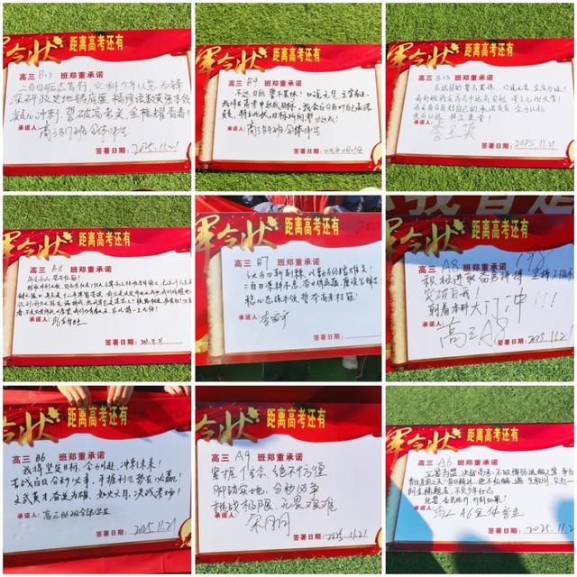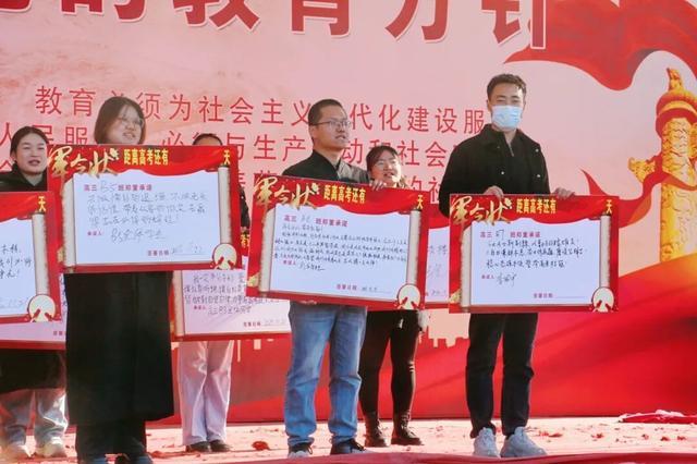 随后,高三全体班主任依次上台,在写有目标的军令状上郑重签下名字。这一笔,签下的是沉甸甸的责任,是全力以赴的承诺,更是与学生并肩作战的坚定决心。