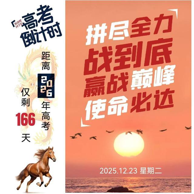 高考,是一场值得全力以赴的成人礼,是你们亲手执笔、定义未来的关键时刻。这166天,足以创造奇迹,重塑人生的经纬。愿你们以信念为帆,以行动为舟,在接下来的每一天里,奋力书写——不负青春,不负梦想,不负这个充满可能的夏天!