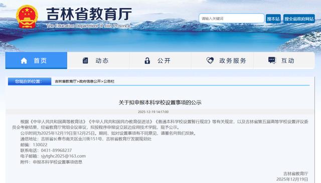 12月19日,吉林省教育厅发布关于拟申报本科学校设置事项的公示,拟按程序申报设立延边应用技术学院。