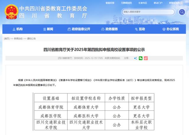 12月19日,四川省教育厅发布关于2025年第四批拟申报高校设置事项的公示,拟申报以成都体育学院为基础设置成都体育大学,以成都医学院为基础设置成都医科大学,以四川交通职业技术学院为基础设置本科层次职业学校四川交通职业技术大学。