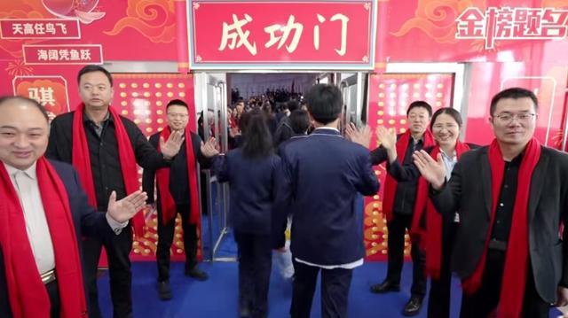 下午3时,激昂的鼓声响彻而起。高三学子们昂首挺胸地穿过那象征着胜利与希望的“成功门”,学校领导和高三教师列队在“成功门”两侧迎接,与每一位步入会场的学子热情击掌,送上“高考必胜”“金榜题名”的美好祝福。