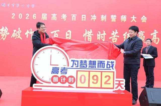 在全场师生的热烈掌声中,校党委书记屈文宏、高三年级主任王兴共同为高考百日冲刺揭牌。红绸落下,“百日冲刺”四个大字熠熠生辉,象征着学子们的冲刺之路正式开启。