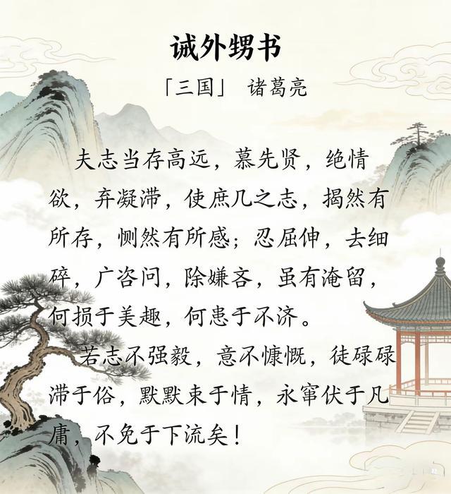 这是一代名相诸葛亮留给后世子孙的心灵箴言,没有空洞说教,没有华丽辞藻,全是历经世事沉淀的人生忠告,将淡泊心性、静心求学、坚守志向的道理,讲得透彻至极。