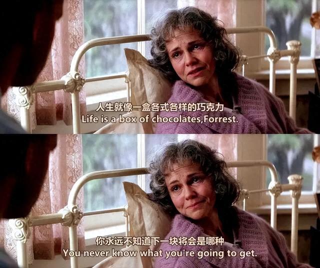 台词:Life is like a box of chocolates. You never know what you're gonna get.(人生就像一盒各式各样的巧克力,你永远不知道下一块将会是哪种).