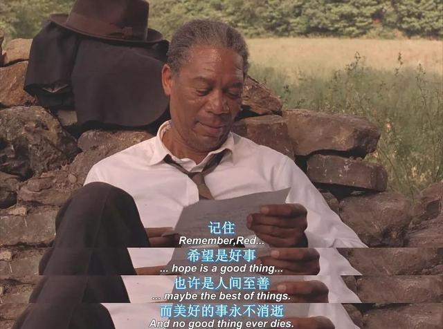 台词:Hope is a good thing, maybe the best of things, and no good thing ever dies.(希望是好事,也许是人间至善,而美好的东西永不消逝)
